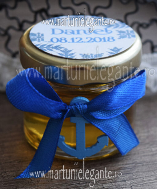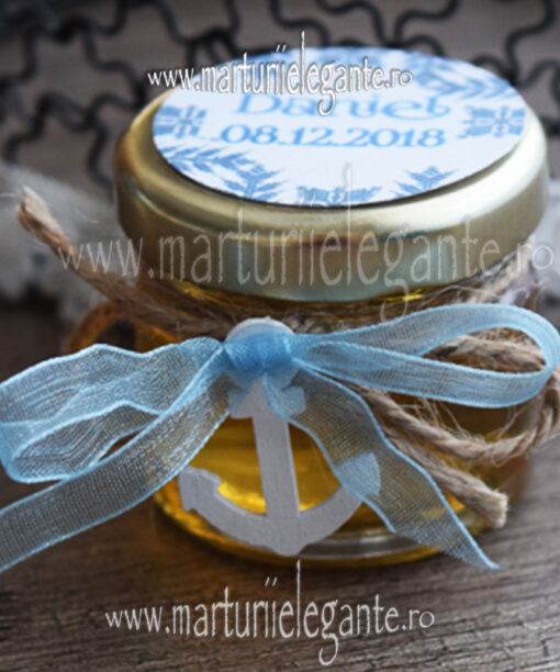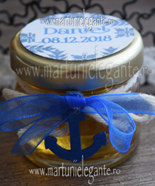 Marturie borcanel cu miere cu ancora maritima este o marturie speciala si eleganta. Accesoriile maritime confera un aspect rustic si special acestei marturii dulci.