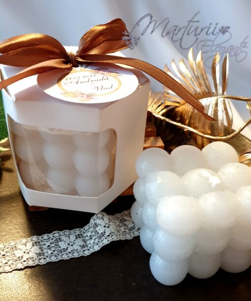 Lumanarea este alba, parfumata, aroma de vanilie.